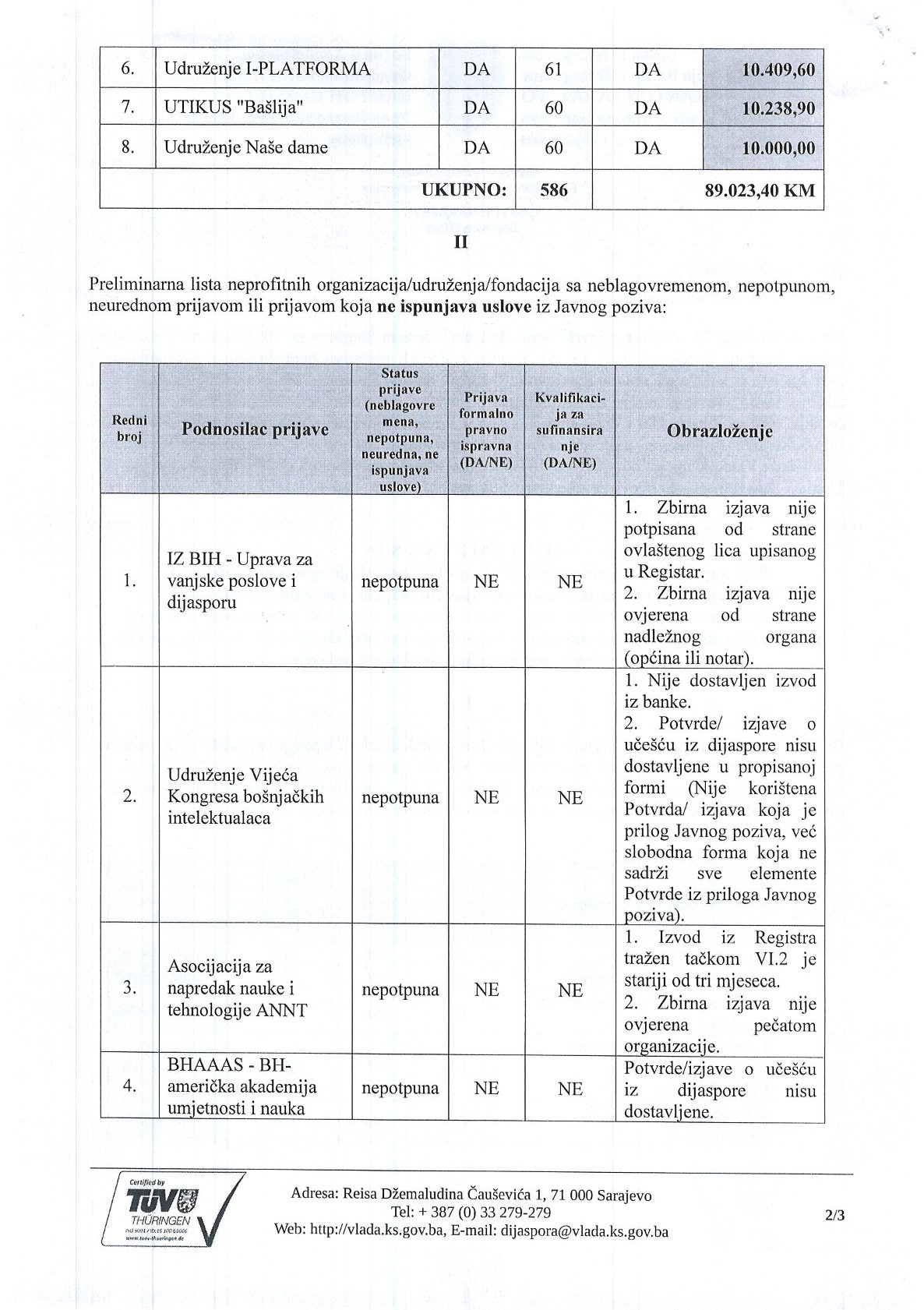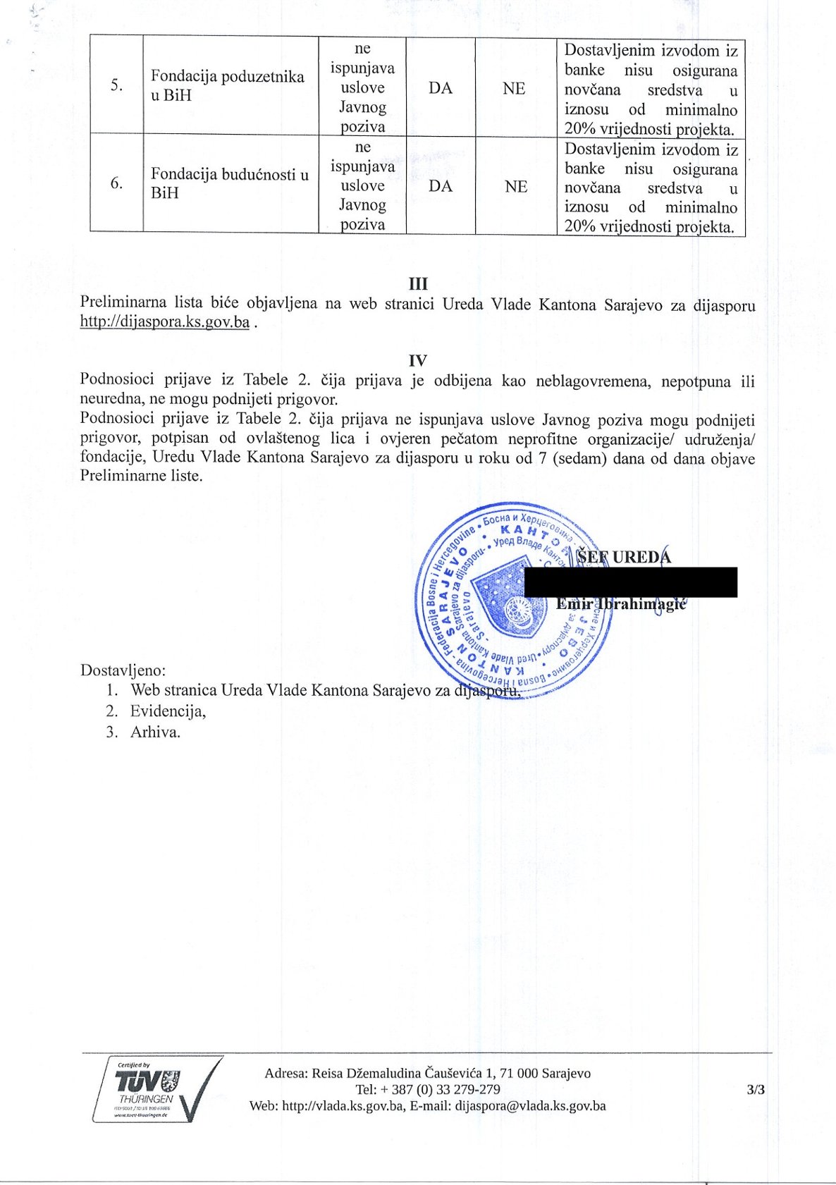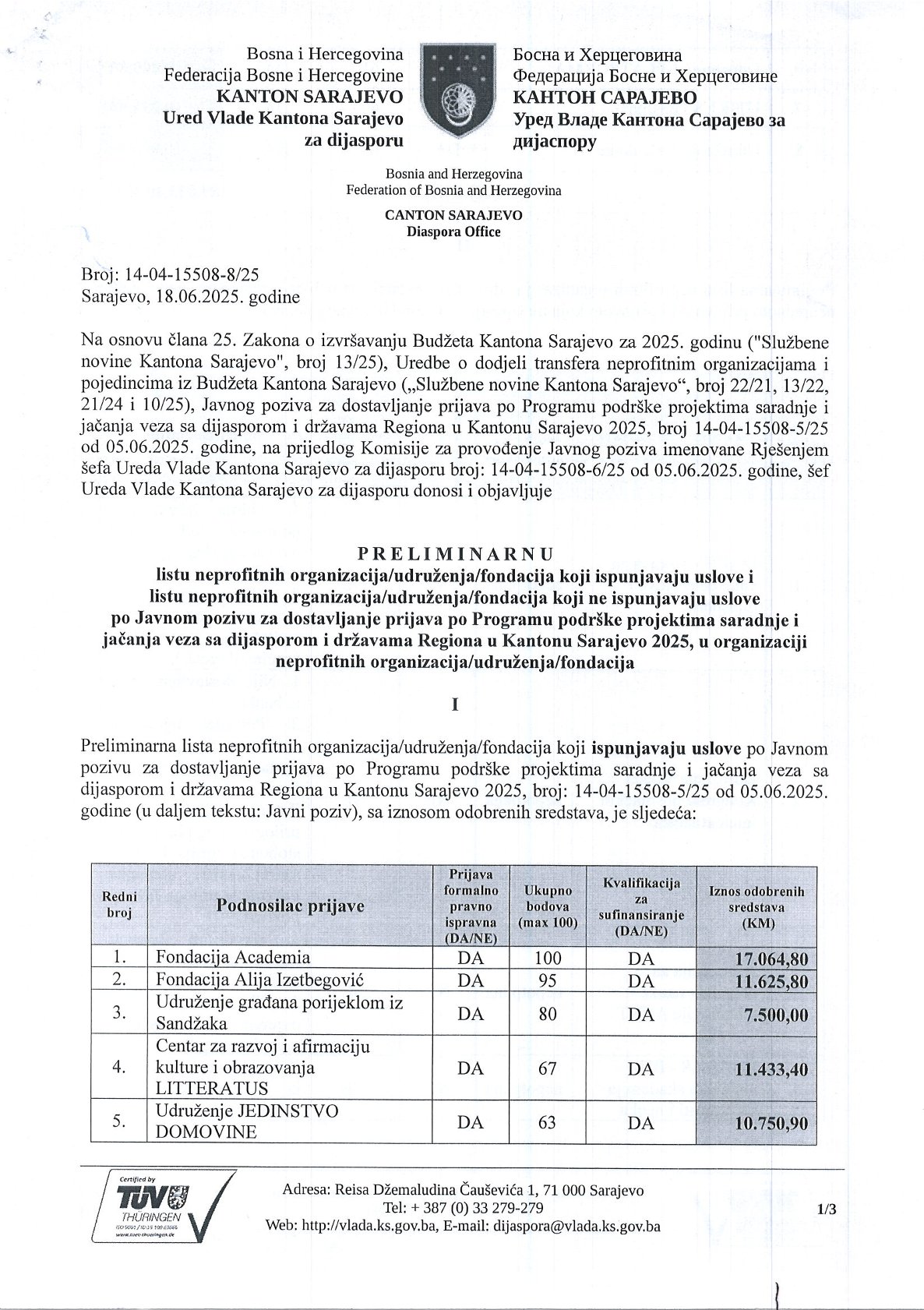 Ured Vlade Kantona Sarajevo za dijasporu objavljuje Preliminarnu listu po Javnom pozivu za dostavljanje prijava po Programu podrške projektima, saradnje i jačanja veza sa dijasporom i državama Regiona u Kantonu Sarajevo 2025.